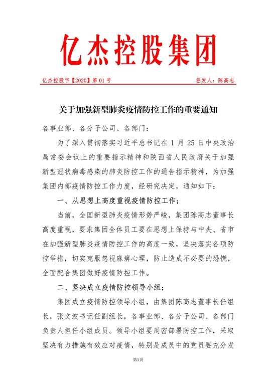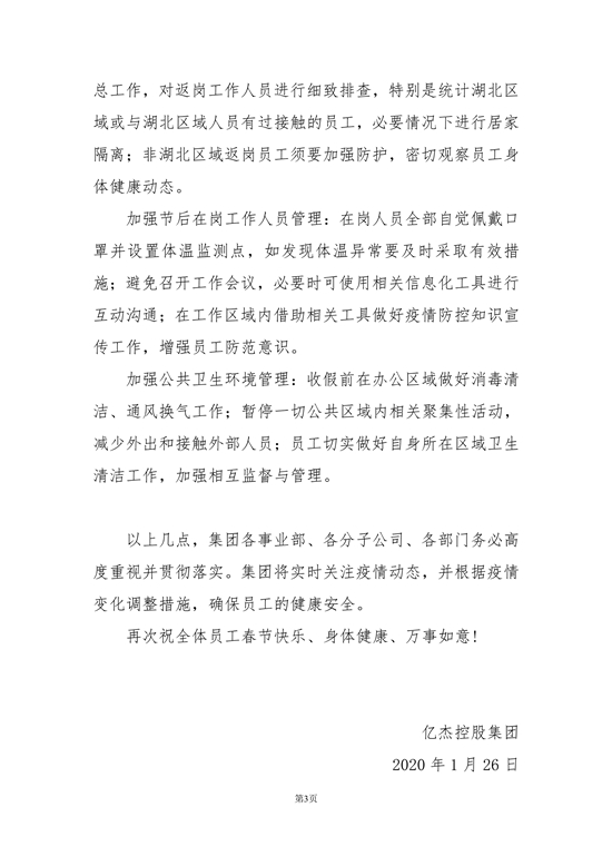 億杰控股集團于2020年1月26日向集團各事業(yè)部、各分子公司、各部門(mén)發(fā)布《關(guān)于加強新型肺炎疫情防控工作的重要通知》,要求從思想上高度重視疫情防控工作,堅決成立疫情防控領(lǐng)導小組,積極響應政府號召、切實(shí)履行社會(huì )責任,做好疫情防控宣傳宣教工作,并對節后相關(guān)工作安排與保障進(jìn)行部署。集團將實(shí)時(shí)關(guān)注疫情動(dòng)態(tài),并根據疫情變化調整措施,確保員工的健康安全。