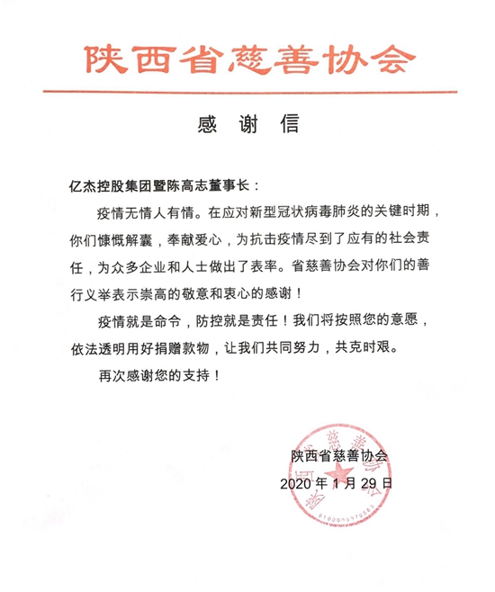 陜西省政協(xié)常委、陜西省工商聯(lián)副主席、陜西省川渝商會(huì )會(huì )長(cháng)、億杰控股集團董事長(cháng)陳高志一直在密切關(guān)注新型冠狀病毒疫情發(fā)展,希望通過(guò)我們的實(shí)際行動(dòng)為疫情防控工作貢獻一份億杰力量。我們相信在黨中央的正確領(lǐng)導下,全體億杰人將與全國人民一起,眾志成城、共克時(shí)艱、攻堅克難,一定能盡快打贏(yíng)這場(chǎng)疫情防控阻擊戰!天佑湖北!天佑中華!武漢加油!中國加油!