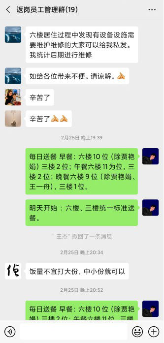 這是在新型能源神木分公司“返崗員工管理”微信群內,黨員賀虎和他的90后送餐小組們?yōu)榉祶弳T工精心提供送餐和其他生活品需求配送服務(wù)的對話(huà)和通知。