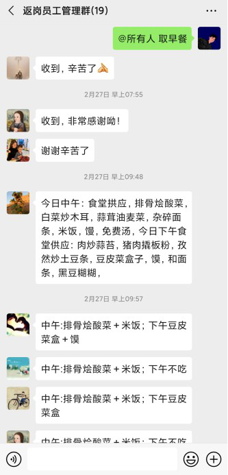 他們不但用微信等向他們推送每日三餐菜單,還調整了在崗職工的集中就餐時(shí)間,錯峰用餐。一方面組織返崗員工通過(guò)微信群做好網(wǎng)絡(luò )訂餐、送餐服務(wù),讓員工在隔離宿舍也能吃到熱騰騰的飯菜。另一方面,保證了在崗職工的用餐安全。