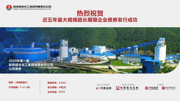 2020年3月13日,陜西煤業(yè)化工集團有限責任公司2020年第一期公司債券在中央國債登記結算有限公司簿記成功。債券發(fā)行規模40億元,期限7+5+3年期,票面利率3.94 %,比同期人民幣長(cháng)期貸款基準利率低近1個(gè)百分點(diǎn),創(chuàng )國內市場(chǎng)近五年超長(cháng)期限企業(yè)債券單期發(fā)行最大規模。本期債券的成功發(fā)行,有效降低了陜煤集團長(cháng)期融資成本,優(yōu)化了資產(chǎn)負債結構,進(jìn)一步改善了營(yíng)運資金流動(dòng)性。