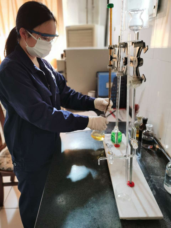 每一步操作都特別小心,藥劑的添加、水樣的取入都必須按照嚴格的規定進(jìn)行操作。清洗好的錐形瓶嚴陣以待,手法熟練的我們在取樣瓶、量筒、錐形瓶之間來(lái)回穿梭,每次量取100ml水樣特別準確一次到位,酸式的、堿式的各種藥劑滴定換用量多少早已經(jīng)刻在我們的心里,搖著(zhù)手里的錐形瓶,水樣和藥劑的碰撞上演著(zhù)不同的“火花”,氯根由黃變橙色、硬度由紫變藍、堿度的由橙變磚紅……給這份普普通通的化驗工作增添了幾分神秘。加藥、查色、讀數、硬度0.014、總堿度8.5,硬度范圍小于等于0.03mmol/L,堿度范圍6~22,氯根是小于400,哈哈,都在合格范圍內。氯根、硬度、堿度三個(gè)指標化驗一氣呵成隨之而來(lái)在水質(zhì)化驗記錄表上填寫(xiě)記錄,這樣一來(lái)工作效率高還減少了化驗過(guò)程中的失誤?;炌旰笥谜麴s水清洗儀器,并在指定位置擺放整齊。
