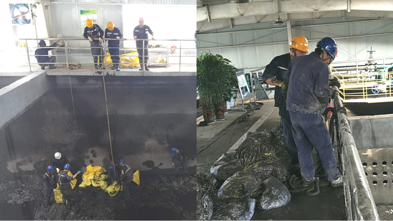 在治水系統中,調節池是污水初步沉降、分離、調節的重要環(huán)節,也是下一道生產(chǎn)工序順行的起點(diǎn)??此菩⌒∈芟薜恼{節池,當你“身入”其中,也有“坐井觀(guān)天”的錯覺(jué)。調節池需要根據生產(chǎn)運行實(shí)況進(jìn)行定期淤泥清理,這是維護調節池運行的一級檢修工作,需要具備在“天時(shí)地利人和”的條件下,本著(zhù)時(shí)間緊、任務(wù)重的方案去開(kāi)展。