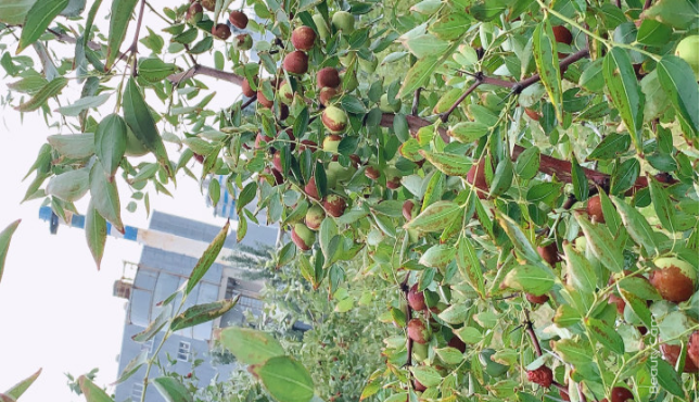 金秋十月,滿(mǎn)樹(shù)果實(shí)累累。紅通通的大棗壓彎了枝頭,看上去真饞人。下班后,三五成群的伙伴約伴去采摘,有全紅的、半紅半不紅的、深紅的、淡紅的、裂開(kāi)縫的、不裂開(kāi)縫的,隨便摘一個(gè)放進(jìn)嘴里,都亦如吃了蜜似的,越吃越愛(ài)吃。