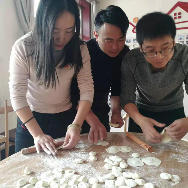 簡(jiǎn)單而不簡(jiǎn)陋,隨意而不隨便。雖然職工食堂大廳空間略顯擁擠,但是大家分工協(xié)作,各司其職,將包餃子的各項工作開(kāi)展的井井有條。女同事發(fā)揮自己平時(shí)在家里做飯的“專(zhuān)業(yè)”特長(cháng),溫艷萍、賀紫霞更是熟練地開(kāi)始和面、搟皮;姚麗霞還當起了老師進(jìn)行現場(chǎng)教學(xué),一邊包一邊講解。