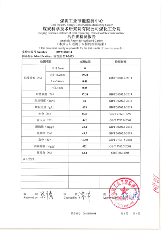 活性焦中試產(chǎn)品通過(guò)煤炭科學(xué)技術(shù)研究院進(jìn)行檢測驗證,其指標已滿(mǎn)足GBT30201-2013《脫硫脫硝用煤質(zhì)顆?;钚蕴俊穱覙藴?。此項技術(shù)的突破,開(kāi)拓了不以傳統煤焦油作為粘合劑的技術(shù),采用新型干粉粘合劑進(jìn)行替代,保護了環(huán)境,提高了產(chǎn)品品質(zhì)。