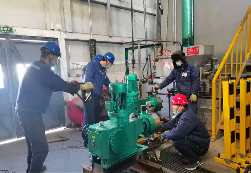 為確保工業(yè)廠(chǎng)區治水優(yōu)質(zhì)高效的完成,近期,由檢修班長(cháng)帶隊,對加藥間的PAM加藥泵進(jìn)行“換新”改造,就是將以前“憑經(jīng)驗”不可視流量調節的老式加藥泵,更換成可視流量方便調試的新式加藥泵。他們按照制定的檢修計劃,對兩臺加藥泵交替運行,對停止運轉的加藥泵進(jìn)行換裝。并由水處理當班運行人員現場(chǎng)協(xié)助,將兩臺運轉的PAM加藥泵和提升泵分別切換至單臺運轉,并將兩個(gè)同時(shí)治水的斜管沉淀池切換至單個(gè)沉淀池,整個(gè)治水系統切換至單組運行狀態(tài)?!傲饣睢眮?lái)了,檢修班眾人將重達幾百斤的新泵搬抬至加藥間,對停止運轉的加藥泵進(jìn)行焊接安裝,水處理運行班長(cháng)李嘉軍進(jìn)行現場(chǎng)運行指導監督。