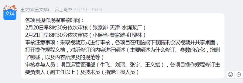 近日,為積極響應公司安全生產(chǎn)管理及疫情防控要求,神木分公司開(kāi)展了業(yè)務(wù)部門(mén)牽頭、項目中心配合、技術(shù)員主講的《操作規程》線(xiàn)上視頻審核。此次審核為該公司線(xiàn)上審核開(kāi)了先例,將工作落到了實(shí)處,體現了高效務(wù)實(shí)的工作作風(fēng)。