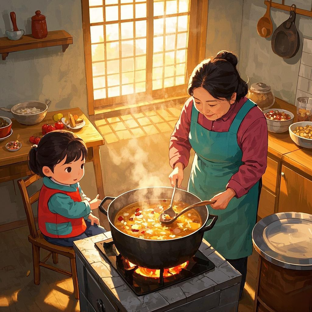 廚房里,母親早已在灶臺前忙碌許久。爐灶里的火苗歡快地跳躍著(zhù),舔舐著(zhù)鍋底,將一鍋臘八粥煮得“咕嚕咕?!弊黜?。紅豆、綠豆、黃豆、黑豆,還有那飽滿(mǎn)的紅棗、圓潤的桂圓、潔白的蓮子以及軟糯的薏仁,各類(lèi)食材在鍋里相互交融、翻滾,色彩斑斕,恰似一幅飽含生活意趣的民俗畫(huà)。母親手持勺子,時(shí)不時(shí)輕輕攪動(dòng),眼神中滿(mǎn)是專(zhuān)注與慈愛(ài)。這一鍋臘八粥,是她對家人細膩深沉的愛(ài),也是對傳統習俗默默無(wú)聲的傳承。